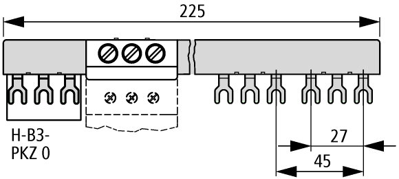для PKZM0‐… или PKE без установленных сбоку вспомогательных контактов или расцепителей напряженияПрименяемое для Шинный соединитель трехфазного тока PKZ0, PKE Защитный автомат Количество 5 Длина мм 225 Интервал разделения мм 45 указания для параллельной подачи питания на несколько автоматов защиты двигателей на клеммах 1, 3, 5