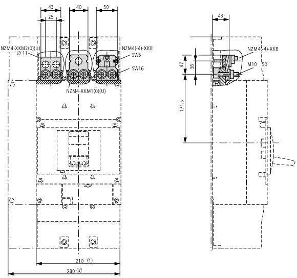 Необходима изоляция крышкой NZM4(‐4)‐XKSA или разделителем фаз NZM4(‐4)‐XKP.