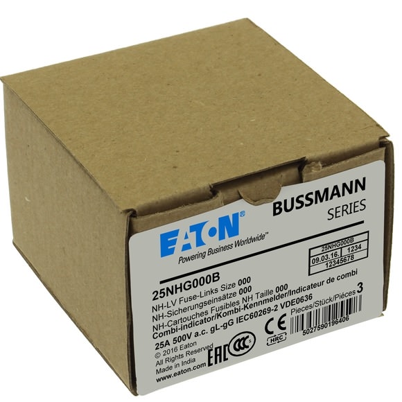 Moeller — Предохранитель, LV, 25 A, перем. ток 500 В, NH000, gL/gG, IEC, двойной индикатор, токоведущие зажимные язычки 25NHG000B