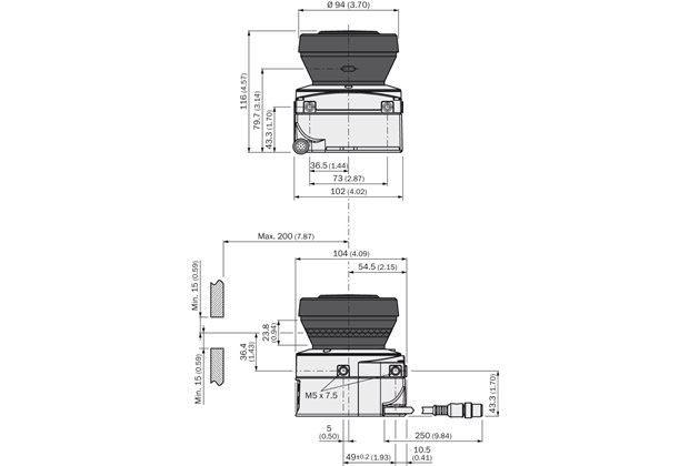 Laser class: 1 (21 CFR 1040.10 and 1040.11, DIN EN 60825:2001) Enclosure rating: IP 65 (EN 60529) Protection class: III (EN 50178) Type: Type 3 (IEC 61496) Safety integrity level: SIL2 (IEC 61508), SILCL2 (EN 62061) Category: Category 3 (EN ISO 13849) Performance level: PL d (EN ISO 13849) PFHd: 8.0 * 1E-08 (EN ISO 13849) TM (mission time): 20 a (EN ISO 13849) Ambient operating temperature: -10 °C ... +50 °C Dimensions (W x H x D): 102 mm x 116 mm x 105 mm Weight: 0.8 kg, without connecting cables Scan angle: 270 ° Protective field range: 3 m Maximum warning field range: 8 m Number of field sets: 1 Type of field set: Triple field sets Response time: 80 ms 1) Resolution: 30 mm, 40 mm, 50 mm, 70 mm, 150 mm, configurable Distance measuring range: 30 m Number of multiple samplings: Configurable 2 ... 16 Electrical connection: Cable, 250 mm, with male connector M12, 8-pin Supply voltage: 16.8 V DC, 24 V DC, 30 V DC Number of universal I/Os: 2 Number of EDM inputs: 1 2) Number of reset-/restart inputs: 1 3) Number of stand-by inputs: 1 4) Number of safe outputs: 2, Safety outputs (OSSD) Number of warning field outputs: 2 5) Configuration and diagnostics interface: RS-232 footnote 1) Depending on basic response time and multiple sampling 2) 3) 4) 5) Availability depends on the configuration of the universal I/Os Техническая информация 1056430-S32B-3011BA.pdf