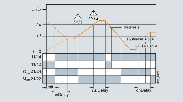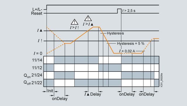 To be able to start a drive when a residual current is detected, the output relays switch to the OK state for an adjustable ON-delay time depending on the selected open-circuit principle or closed-circuit principle.